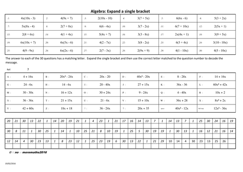 Algebra Expand A Single Bracket To Decode The Message Teaching Resources